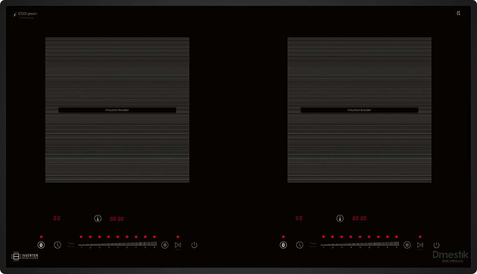 - Có 9 mức điều chỉnh nhiệt và Booster 2 vùng nấu.