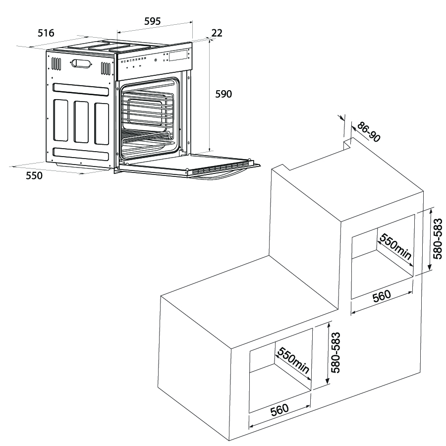 · Kích thước khoét đá/tủ (Cao x Dài x Sâu): (580-583) x 560 x 550 (mm).