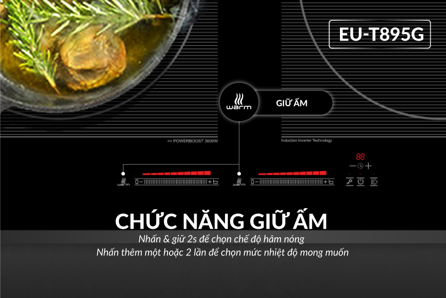 Không chỉ mạnh mẽ, EU-T895GE còn ứng dụng công nghệ Bridge Inverter thông minh, cho khả năng tiết kiệm điện vượt trội so với bếp từ thông thường. Inverter giúp bếp hoạt động ổn định, hạn chế hao phí năng lượng khi duy trì nhiệt độ thấp hoặc vừa, từ đó giảm chi phí điện cho gia đình mà vẫn giữ được hiệu suất nấu nướng tối ưu.