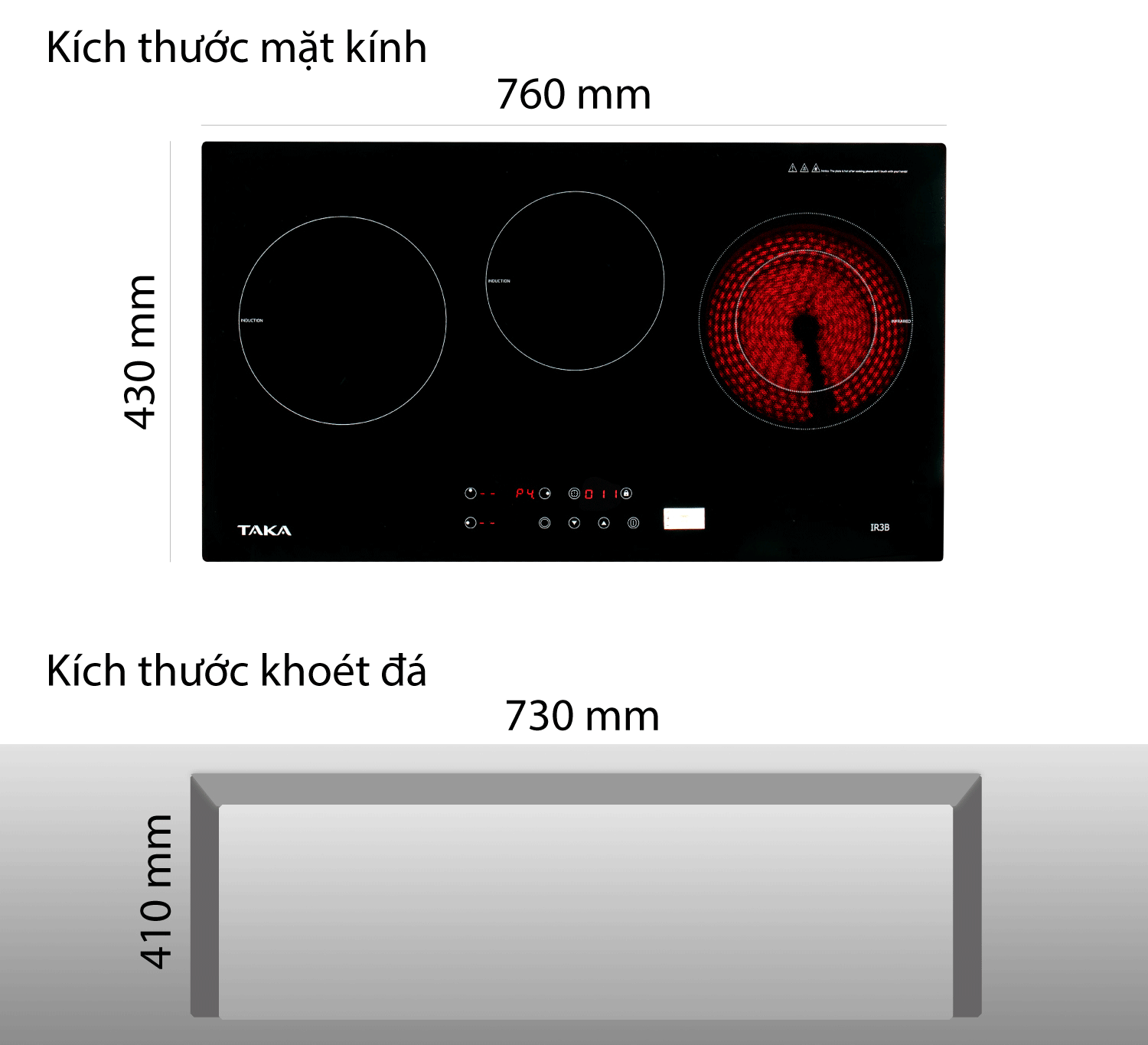 được trang bị 3 vùng nấu hỗn hợp (2 từ và 1 hồng ngoại) với kích thước mặt kính