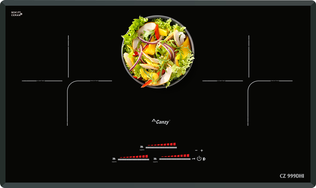 Vùng nấu từ của bếp từ nhập khẩu Canzy CZ 999DHI sử dụng mâm từ EGO cao cấp, tự động nhận diện kích thước vật dụng nấu giúp tiết kiệm từ 17-20% điện năng tiêu thụ của bếp so với những chiếc bếp từ không sử dụng loại mâm từ này. Kích thước của mỗi vùng nấu là bằng nhau và đều thể hiện dòng chữ IH Induction với ký hiệu vùng nấu hình chữ thập mang vẻ hiện đại và có tính thẩm mỹ cao. Hiệu suất đun nấu của bếp đạt đến 90% giúp nấu ăn siêu tốc, rút ngắn đáng kể thời gian nấu ăn của bạn. Điều khiển cảm ứng dạng Slide Controlbạn chỉ cần chạm nhẹ và vuốt là đã có thể điều khiển bếp, cảm ứng nhiệt nhạy và có thể dùng được ngay cả khi tay ướt.