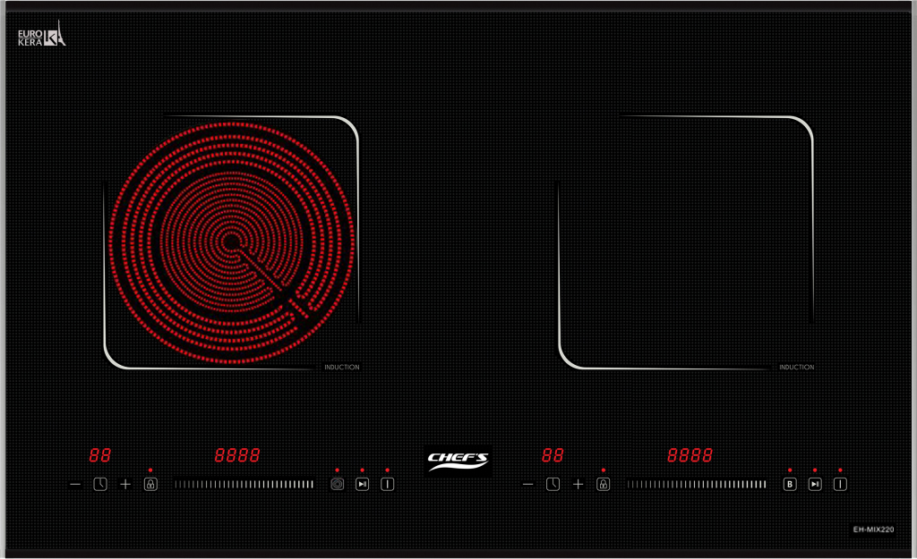 Bếp điện từ Chefs EH-MIX545N gồm 3 vùng nấu với với tổng công suất chia sẻ là 5500W. Vùng nấu từ phải trên có công suất 1600W khi kích hoạt tính năng nấu siêu nhanh Booster công suất lên tới 2000W. Vùng nấu từ phải dưới có công suất 1600W khi kích hoạt tính năng nấu siêu nhanh Booster công suất lên tới 2000W. Vùng nấu hồng ngoại trái trang bị mâm nhiệt E.G.O Hi-Light với 03 vòng nhiệt có công suất 2300W. Chức năng Booster nấu siêu nhanh, tuy nhiên thời gian tối đa mặc định dùng chức năng này là 10 phút / lần tránh quá tải