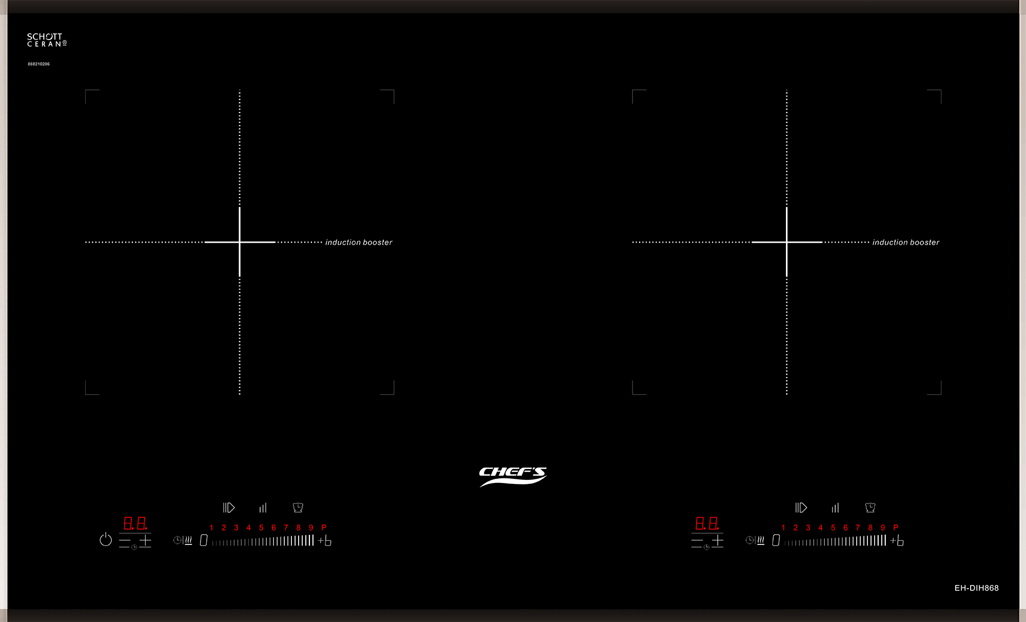 Bếp từ đôi Chefs EH-DIH868 vẫn sử dụng mặt kính Schott Ceran giống như những mẫu bếp từ cao cấp nhập khẩu từ Đức hoặc Tây Ban Nha khác. Tương tự như Cata, các sản phẩm dòng bếp cao cấp của Chefs đều có mã số riêng trên mặt kính sau chương trình ký kết hợp tác với công ty Schott Ceran – Germany.