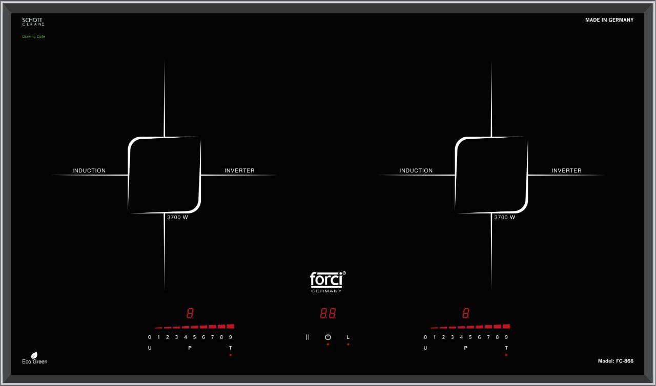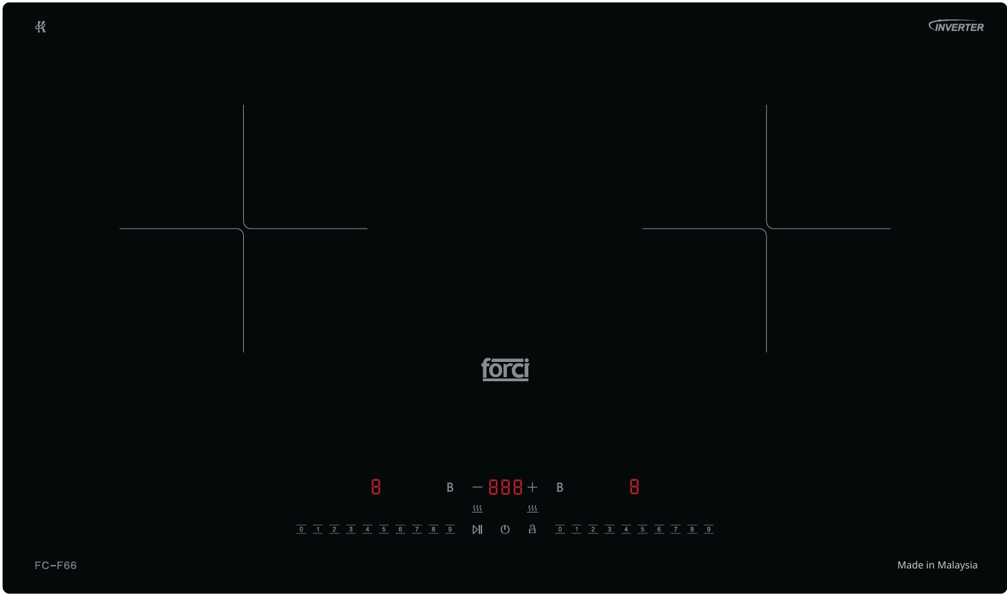 Bếp từ Forci FC - 866 được tích hợp chức năng tự nhận diện vùng nấu, khi ta đặt nồi lên 1 trong 2 vùng nấu sau đó ấn nút khởi động bếp sau thời gian 1-2 giây bếp sẽ tự động tìm vùng nấu đã có nồi, ta chỉ việc điều chỉnh mức công suất to nhỏ theo ý muốn mà không phải thao tác chọn vùng nấu như bếp thông thường. Công nghệ Inverter được áp dụng trên bếp có khả năng phản ứng thay đổi công suất theo điều khiển ngay tức thì, khi người dùng điều chỉnh tăng giảm nhiệt độ đun nấu, bếp điều chỉnh thay đổi tức thì về mức nhiệt độ mong muốn.